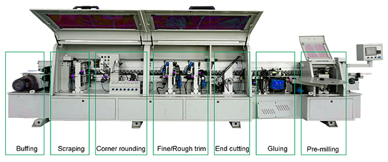 บอกว่าเครื่องปิดขอบอัตโนมัติมี 8 ฟังก์ชั่นหลัก ส่วนใหญ่ใช้สำหรับปิดขอบโต๊ะ ตู้ ตู้เสื้อผ้า และเฟอร์นิเจอร์แนวเส้น การติดกาวอัตโนมัติและแม่นยำ การขัดสองด้านชิ้นเดียว ใช้กาวอย่างสม่ำเสมอและการลำเลียงมีความเสถียร