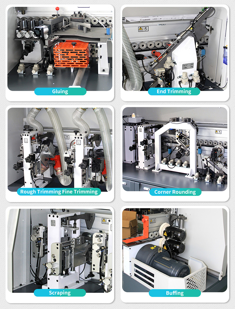 เครื่องรัดขอบมี 8 ฟังก์ชั่น ได้แก่ การขัด, การขูด, การตัดแบบละเอียดและหยาบ, การติดตามขอบแบบกลม, การตัดส่วนปลายและการติดกาว และรองรับการพลิกและการลำเลียงอัตโนมัติ